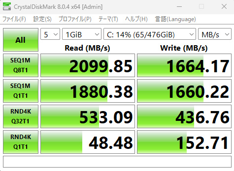 CrystalDiskMarkの設定はデフォルトで行っています。Read 2099.85MB/s Write 1664.17MB/sは私的には満足です。十分なスコアではないでしょうか。