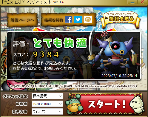 このスコアは意外にも「とても快適」と出ました。あまり期待はしてなかったんですが、ドラクエXはそんなに重いゲームではないんですね。